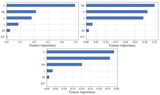 With the above set of model parameters, the importance of each geotechnical feature is firstly calculated in the random forest model for the consumption factor grease (tail grease, EP2 grease and seal grease). The obtained results are shown in Figure 14, with the vertical axis being the geotechnical features and the horizontal axis being the magnitude of corresponding importance. It can be seen from the three subfigures that the compressive strength () of material has the most important impact on the prediction of all the three types of greases. More precisely, the strength parameter exhibits obviously the greatest importance than other geotechnical parameters for consumption of tail grease (first subfigure of Figure 14), where the correlation is more than 48%. While for seal grease (third subfigures), the most significant geotechnical parameter is also the strength, the difference with the second parameter is not that much greater than that in the first one (the following important feature is a void ratio). Notice for the EP2 grease, for the strength in the second impactful geotechnical feature, the difference with the first one (fak) is not great. Consequently, the strength can be concluded as the most impactful geotechnical parameter on the consumption of greases in general. The accuracy levels for Figure 14 are 0.9413, 0.9357 and 0.9608, respectively.