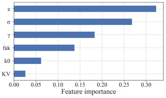 On the contrary, concerning the consumption of grouting, the most important geotechnical parameter is obtained as the void ratio () of the material, instead of the strength (Figure 15), which is in second place. The corresponding importance is 0.27. It is reasonable that the grouting quantity is related to the void ratio of the material from the point of view of geomechanics, because large porosity will lead to more backfill grouting in shield tunneling. As a result, the strength of soil or rock is not the most important feature for all the considered consumption factors. In order to find a single geotechnical parameter for the classification of the quota of budget in complex geological conditions, more computation of the total cost is needed to verify the selected feature, verifying if it can be used as the classification index in general. This will be provided in the next subsection.