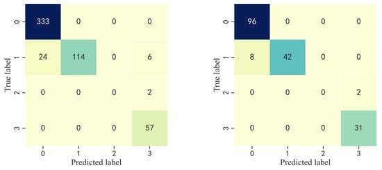 In Figure 19, the number of correct predictions and the number of incorrect predictions for tail grease are displayed in two subfigures (left: training set; right: test set), respectively. Consequently, the accuracy levels for calculating the variable importance can also be obtained by Equation (11). It is seen that the obtained results by the proposed model are reliable. In order to avoid repetition, the confusion matrix for other factors is not illustrated here.