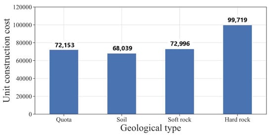The total cost of the tunneling project per meter is provided in Figure 20. The cost for each factor can be calculated by the use of the values in Table 4, and the total cost can be obtained by accumulating the components. It is seen that the total cost in tunneling also has an evident positive correlation with the compressive strength, increasing from soil to hard rock. Although the most impactful geotechnical feature for grouting is not the strength (because the most impactful geotechnical parameter is a void ratio), the strength can still be used for defining the new quota of budgets in complex geological conditions. The total cost for soft rock is close to the original budget of the shield tunneling project, while that for soil is 6% lower than the standard cost. What is more, the total cost for hard rock is 38% higher than the standard cost, which cannot be ignored in complex conditions. This is the most important remark of this study, that the compressive strength can be chosen as the classification index, and the proposed categories in Table 3 are an effective reference scheme.
