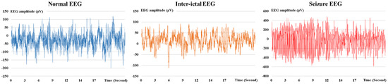 Samples of normal, interictal, and seizure EEG signals from the Bonn University data set.