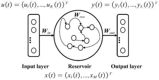 The weights from the input layer to the reservoir layer amongst the internal neurons in the reservoir layer, and from the reservoir layer to the output layer, are denoted as , and , respectively.