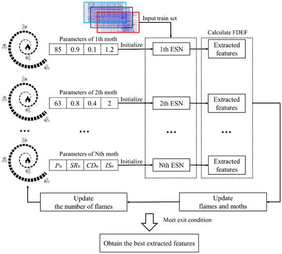 To improve the above shortcomings, moth–flame optimization is used to select the hyperparameters of ESN, named MFO-ESN. Meanwhile, a novel evaluation function (FDEF), which can evaluate the performance of the feature extractor in a detailed and more objective way, is proposed as the fitness function of MFO-ESN.