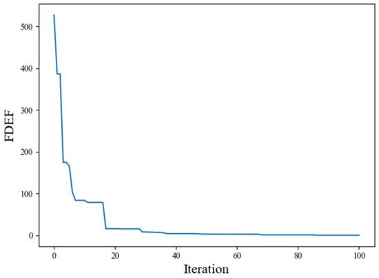 We separated the training set and testing set using a random division whose division ratio is 8:2, and the MFO-ESN was trained with the training set. During each iteration of MFO-ESN, we recorded the fitness function FDEF and hyperparameters of the best extractor in the training set. Figure 4 shows the change of FDEF as the number of iterations increases.