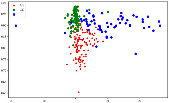 To visualize the distribution of the extracted features, two dimensions of the extracted features are shown in Figure 5. It can be observed that the distribution of the three classes of the extracted features is regional. The first dimension of the class of A/B and the class of C/D is close because the EEG of two classes is not in the epileptic period. The second dimension is obviously different, which reflects the difference of two classes, i.e., the class of A/B is from healthy people, while the class of C/D is the inter-ictal EEG.