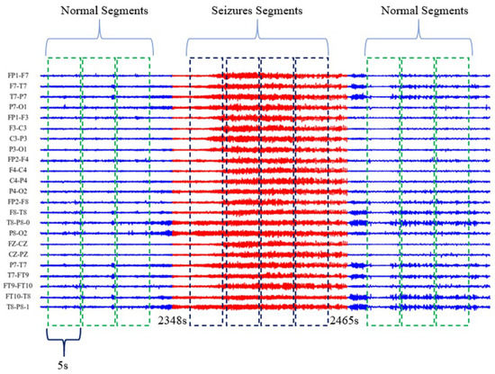 A total of 198 seizures are manually annotated by medical specialists (pointing out the start time and end time) in 916 h. There are 45 s of seizure activity recordings on average that are too small compared to the normal EEG signals. To increase the sample number of seizure class and balance the data set, the data used in the experiments are converted into a series of segments using a sliding window whose size is 5 s, and every segment contains 23 channels as case 1. Segments belonging to a normal class do not include seizure EEG signals annotated by the experts; meanwhile, segments belonging to a seizure class do not include normal EEG signals. Figure 6 shows a period of EEG signals of case 5 and, according to the doctor’s annotations, the seizure begins in 2348 seconds and ends in 2465 seconds. The five-seconds-long window slides on the EEG signals without overlapping. In more detail, for a 117-seconds-long seizure process, we can obtain 23 segments of 5 seconds in length.