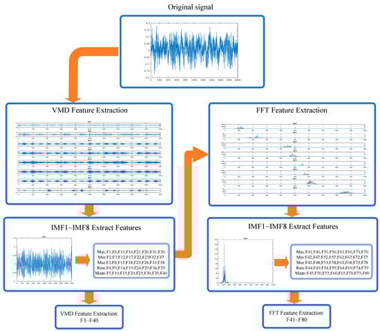 VMD minimizes the sum of the estimated bandwidths of each mode, where each mode is assumed to be a finite bandwidth with a different center frequency. To solve this variational problem, an alternating direction multiplier method is used to continuously update each mode, and its center frequency is gradually demodulated to the corresponding baseband; finally, each mode, that is, the corresponding center frequency, is extracted together. We extract the max, min, mse, rsm, and mean values from each of the eight IMFs decomposed by VMD. The features extracted in VMD are F1~F40. The eight IMFs decomposed by VMD extract the maximum value, minimum value, and average value through FFT analysis. The features extracted in the FFT are F41~F80. Eighty features were extracted in feature extraction. Its calculation method is shown in Figure 1.