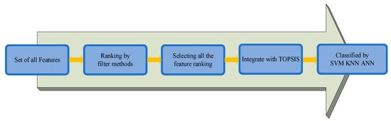Combination of filter methods in TOPSIS: This study proposes a combination of four different filter methods, as shown in Table 2. Due to the wide variety of filter methods, after excluding unsuitable types, six common filter methods were selected in this study, and only six combination methods have certain limitations on the weight of the optimal ranking, using other types of feature selection. The type of model needs further study.