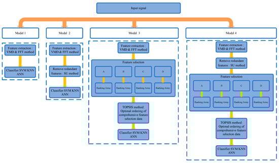 In this case study, the proposed bearing fault diagnosis model is compared with state-of-the-art models. Since the results in Table 5 show that the six-select method achieves better results in model 3 and model 4, the six-select method is the main method in model 3 and model 4 in the three classifiers in Table 5. The accuracy of the bearing motor current signal dataset in model 4 is 78.72% for the KNN classifier, 91.82% for the SVM classifier, and 99.48% for the ANN classifier. The proposed model with the ANN classifier achieves the highest accuracy in the bearing motor current signal dataset