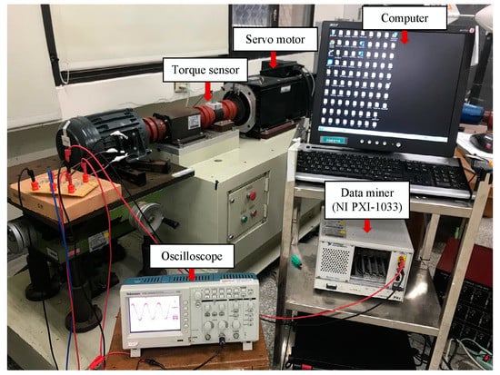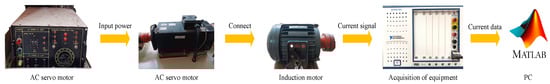 First of all, this study measures the current signals of an AC induction motor in four conditions (normal, bearing, rotor, and stator) and obtains arbitrary phase data for the motor U, V, and W through the NI signal extractor. The data sampling time for each measurement is 100 s, and the collection frequency is 1000 Hz. Each signal measurement is evaluated 100 times to complete the premeasurement operation.
