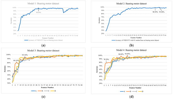 (a) Model 1: Bearing motor dataset of the VMD-FFT method in an SVM. (b) Model 2: Bearing motor dataset of the VMD-FFT method with redundant features removed by the SU method in an SVM. (c) Model 3: Bearing motor dataset of the TOPSIS method not removing features in an SVM. (d) Model 4: Bearing motor dataset of the TOPSIS method with redundant features removed by the SU method in an SVM.