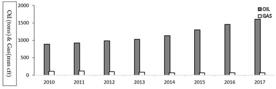 Pakistan’s transportation sector depends on non-renewable energy, which consumes 80% of liquid fuel. In recent years, especially after 2010, Pakistan has witnessed phenomenal growth in the demand for vehicles and oil energy. In contrast, gas energy consumption has fluctuated with declining trends (Figure 1). The total registered vehicles on the road were 11,490 thousand in 2010, which has increased to 25,000 thousand in 2017. Similarly, the oil energy demand for road transport has increased from 8.89 million tons in 2010 to 16.05 million tons in 2017. Whereas, in these years, the transportation sector consumed 70,455 mm cubic feet (mm cft) and 113,055 mm cft CNG (CNG stands for Compressed Natural Gas), respectively [4]. Road transportation is the most cost-efficient medium of transport, which has a positive impact on the process of economic growth and development (https://transportgeography.org/contents/chapter3/transportation-and-economic-development/ and https://www.finance.gov.pk/survey/chapters/14-Transport%20final08.pdf, accessed on 10 January 2023). Pakistan is facing high demand for road infrastructure to meet the transportation need of the increasing population and growing economy. The govt. of Pakistan has recently constructed forty-seven national highways, expressways, and motorways, with a cumulative length of road 12,743 km under the umbrella of the National Highway Authority, and launched thirty-eight new transport projects with an estimated cost of 1104 million dollars under the Pakistan Social Development Program in 2018. Further, the China–Pakistan Economic Corridor project of the Belt and Road Initiative, with an estimated cost of more than 28.5 billion dollars, has also boosted trade activities. These projects are expected to enhance road transportation drastically, increasing the demand for liquid energy.