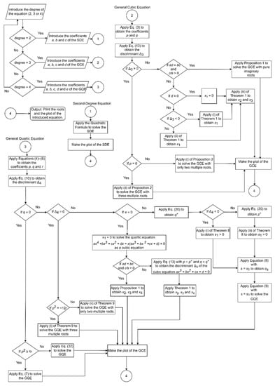 In spite of these important facts, in practical terms, to solve the GQE and the DQE, it is obvious that Equation (36) is essentially the SFRC given by Equation (17); therefore, Equation (36) can also be defined here as the “Bicubic SFRC”, whose properties are material for a subsequent article because the relationship between the nature of the roots of the GQE and the nature of the roots of Equation (36) in terms of rationality can be very useful for designing more sophisticated and accurate algorithms to analyze and solve the GQE without numerical methods or complex arithmetic.