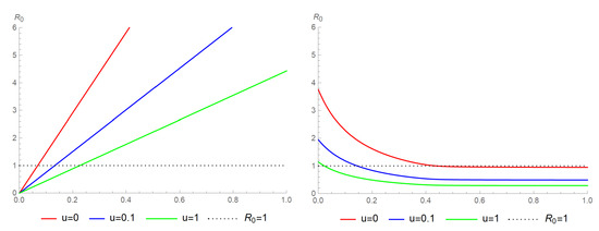 The diagram on the left illustrates how the reproduction number depends on the infection rate, , for different constant controls, . Meanwhile, the diagram on the right demonstrates how the reproduction number varies with the migration rate, , for different constant controls, u.