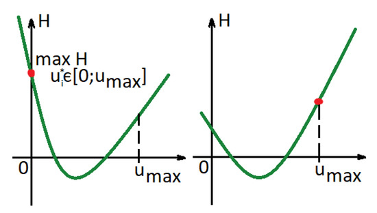 where , , and . There exist three different types of points at which the Hamiltonian reaches its maximum (Figure 4). To find them, we need to consider the derivatives of the Hamiltonian at and . If the derivatives (26) at are non-increasing (), then the value of the control that maximizes the Hamiltonian is less than 0, and according to our restrictions (), the optimal control will be equal to 0 (Figure 4 (left)). If the derivatives at are increasing (), this implies that the value of the control that maximizes the Hamiltonian is greater than . Hence, the optimal control will be 1 (Figure 4 (right)). Otherwise, we can find the value of (see Figure 4 (middle)):