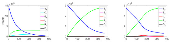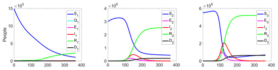 Experiment 1. In the current experiment, we present the SQEIRD model under the assumption that the quarantine and vaccination are not possible for susceptible individuals (, , and ). Using the specially developed procedure and taking into consideration the cluster structure of the population, we obtain the result that the epidemic starts and reaches its maximum faster on the first level than on levels 2 and 3 in the uncontrolled case. At the second and the third clusters, the epidemic starts with delays. Figure 5 and Figure 6 demonstrate this fact.