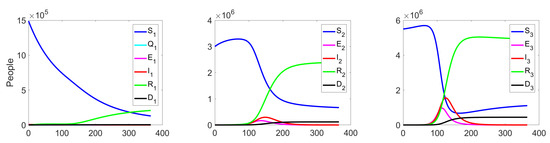 Figure 11 shows the change in the fractions of the quarantined, exposed, infected, and dead population at all three levels. According to the quarantine measures, the citizens should stay at home, but there is a small fraction of residents that do not comply with these measures, which leads to their infection.