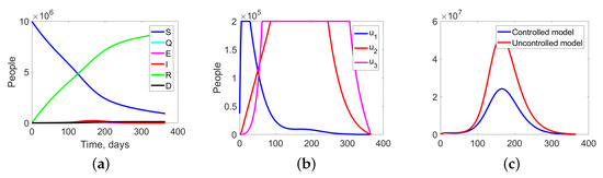 Figure 12a shows the aggregate changes in all fractions of the population, while Figure 12b represents the structure of the optimal treatment policies , . The controlled case results in a significantly lower aggregated system cost of m.u. compared to the uncontrolled case’s cost of m.u. (Figure 12c).