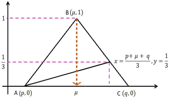 The -coordinate in Equation (30) takes the average of minimum , mean and maximum values along the bottom side of the triangle, whereas the -coordinate is taken as the one third of the height of the triangle, as depicted in Figure 1. The graph of the TrFN, is the triangle ABC with (and as the edge points. The intersection point of ABC is the median [45].