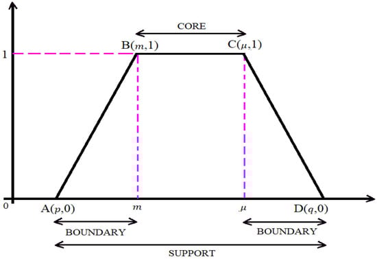 In TpFN theory, it includes four values to acquire an accurate result [46]. Equation (31) shows a slight difference at the core that holds the value 1 for the range of between the median and the mean values, in comparison to TrFN. The graph of the TpFN, is the trapezium ABCD with ( and as the edge points in Figure 2.
