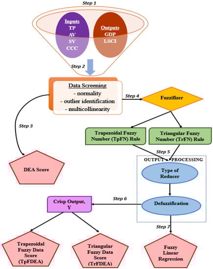 There are three main methodology outcomes from this research, which are divided into DEA, fuzzy DEA and fuzzy linear regression. The step-by-step procedures as supported by Figure 3 are listed as follows: