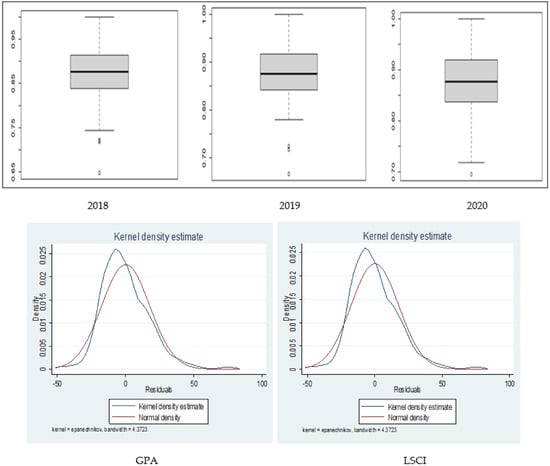 The data were normally distributed after two countries were removed from the dataset by using the STATA software. Box plot was performed to check the outlier, and it was identified that three countries (Cabo Verde, Slovenia and Curacao) had extreme values compared to other countries, as shown in Figure 4. The three countries were then removed from the study, making only 133 countries left for further analysis. The output from STATA showed that the data for LSCI and GDP were normally distributed. Kernel density estimation showed that the probability density function contributed towards the improvement of the distribution in comparison to the traditional histogram. Normal density in the study showed a symmetric, single-peaked bell-shaped density curve, therefore, the dependent variables were normally distributed.