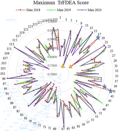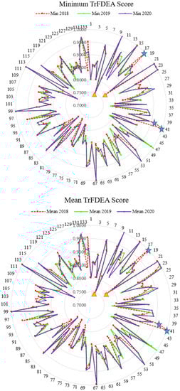 Figure 5 shows the minimum, mean and maximum values of TrFN for 3 years. The radar charts depict that the efficiency scores were moving up and down with involvement of the fuzzy numbers in the variables. Some examples (denoted by star and triangle) clearly show the differences in the 3-year radar charts observed from the results of DMU 17, DMU 40 and DMU 41 where their fuzzy efficiency scores were very high in 2018 in comparison to 2019 and 2020. In addition, the fuzzy efficiency scores were very low for DMU 8 and DMU 21 in 2018, in comparison to 2019 and 2020, across the minimum, mean and maximum scores spread. The fuzzy triangular efficiency scores showed the average and standard deviation values for three years. The mean and the standard deviation for 2018 were 0.8808 and 0.057504, for 2019 were 0.8825 and 0.05385995 and for 2020 were 0.8823 and 0.05699, respectively.