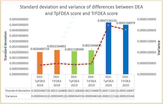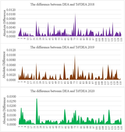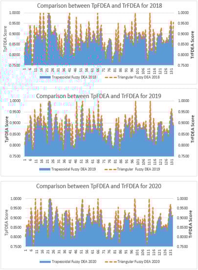 Figure 6 shows the difference between DEA and TrFDEA approaches in determining the efficiency scores. The TrFDEA method gives better predictions for the seaport network efficiency as it introduces more measurable and specific terms through the utilization of TrFN. The TrFN theory reflects that efficiency scores in 2020 had the highest impact in comparison to the scores in 2018 and 2019. The TrFDEA and classical DEA give perfect efficiency scores of DMUs 22, 23, 66, 99 and 112 for all 3 years. There were new additions of perfect efficiency scores in 2018 (DMU 15 and DMU 41), 2019 (DMU 52) and 2020 (DMU 52 and DMU 10). The section’s major goal is to discuss the utilization of TrFNs as a substitute tool to improve the seaport network efficiency measurement between DEA and TrFDEA. The procedure used to achieve the aforementioned efficacy was pretty evident. Specifically, the mean value of the seaport network efficiency was equal to the average value of each TrFNs.