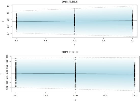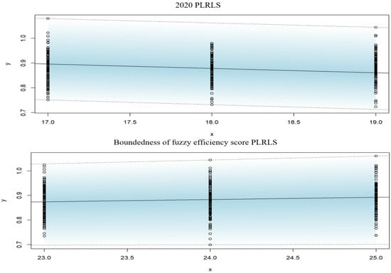 Fuzzy set theory has been generally used to formalize and address the impreciseness of uncertainty in human decision-making. The importance of fuzzy characteristics in DEA is that they can permit flexible and quite accurate results. A general effectiveness examination was performed with a relative efficiency analysis of a set of DMUs. A fuzzy number is necessary for the study since the efficiency is calculated based on a real set of data, while the classical way of measuring efficiency is often inconsistent with reality. A study conducted on port efficiency based on Taiwan’s international ports by Wang et al. [19] that utilized fuzzy DEA to measure DMUs based on fuzzy number features gave more information than the standard DEA with crisp values. Additionally, fuzzy DEA calculation can indeed avoid input or output orientation during execution. Another study conducted by Wanke et al. [20] highlighting factors (operator type, cargo type, accessibility, berth usage, port service quality etc.) and port efficiency predicted by using fuzzy regression, shows the association between them in the case of a Nigerian port. In standard linear regression, the coefficient of determination () indicates the variance in the output variable that can be explained by the independent variable’s variation, whereas in fuzzy regression the goodness of fit measure is the mean squared distance between the fuzzy responses and the model predictor [21]. Skrabanek and Martinkova [22] reported that the low value of mean square error indicates that the model is close to observation. To adapt fuzzy linear regression techniques, the probabilistic and statistical approaches can be combined with least squares, which is known as the Possibilistic Linear Regression Least Squares (PLRLS) technique. This technique, firstly proposed by Lee and Tanaka [23] to manage fresh data sources and fuzzy outputs, fits the model’s central tendency prediction and the spreads (lower and upper bounds) via the possibilistic approach.