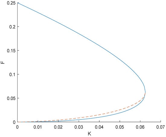 Hence, we have three equilibrium points at , and at Equation (31) , as does Equation (32) . Let be independent points of equilibrium and the other two be dependent as they depending F and K. Dependent points of equilibrium exist when , and by simple calculations of calculus we can find the maxima of K giving exactly two points of equilibrium. The critical point is at as shown in Figure 1.