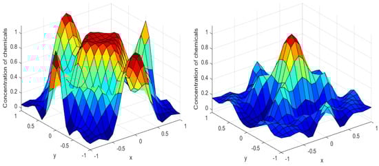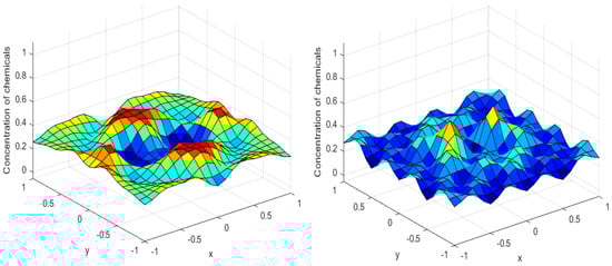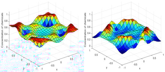 where are matrices that are diagonal, having positive constants diffusion coefficients. The functions f and g depend on the reactant concentrations, so they have great importance. Reaction–diffusion systems, which Turing initiated, follow one of two types: continuous or discrete. Reaction–diffusion systems that are discrete systems typically have cells and lattice coupling through their membranes via mass transfer. Hence, when compared to the continuous ones, they can be considered closer to biological systems [28]. Discrete systems are less popular than the continuous systems. Turing noted that if one chemical is stronger than the other and both work in opposition, then the homogeneous state of solution would shift to the nonhomogeneous state. He suggested the name diffusion-driven instability for that unstable state of solution as it was derived from diffusion, and so the pattern concentration causes [29]. The general form of the Turing mathematical model is