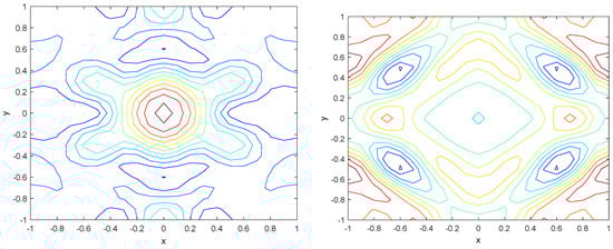 The solution has the terms that have J’s eigenvalues in the exponent, so if any eigenvalue of J has a positive part, then the system will become unstable because of the gradual increase in the perturb values of and . Hence, we must have negative real parts of eigenvalues of J. For the system of Gray–Scott, we have the matrix of stability as