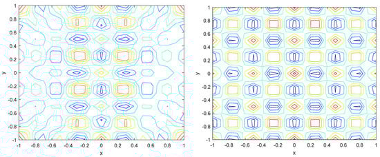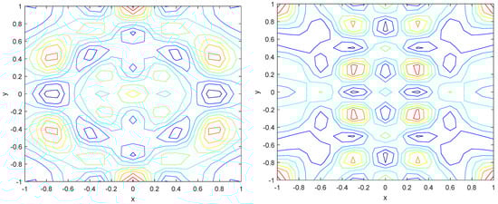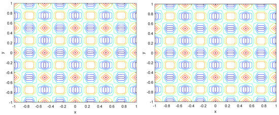 Numerical simulations were performed to obtain different pattern formations from simulating a reaction–diffusion system based on the Gray–Scott model. We adopted a Chebyshev spectral method having the exponential rate of convergence to discretize the Gray–Scott model in spatial coordinates. The resulting system of ordinary equations was then solved using the RK-4 method, which is one of the most stable methods for time stepping. For our numerical simulations, we kept the diffusion as and , while the parameters of reaction were set as and . The contour maps of simulations are shown in the figures below at different levels of time. Red shows the most concentration and blue the least. First, it can be seen that the concentration is high at the center as shown in Figure 2. As the simulations continue, it seems that the output shows the four regions of chemical concentration splitting into increased concentration towards the boundaries which can be observed in Figure 3 and Figure 4. The wave-like propagation can be observed having approximately a constant velocity with a perturbed leading edge as shown in Figure 2, Figure 3 and Figure 4. After the initial spread of perturbation, the asymptotic state which is subject to some values of parameters involved in the system, which may depend on time, was obtained. We then observed that with the increasing of time, the circular waves produced and took the motion of a transverse wave. For the development of surface plot we obtained the results until time reached 1000. Keeping the perturbation at the center, one can observe that the perturbation spread towards the boundaries as shown in Figure 2, Figure 3 and Figure 4. The contour plots shown in Figure 5, Figure 6, Figure 7 and Figure 8 shows that after the initial perturbation in the presence of a gradient, the spots will exist and get larger in size having blue regions. These regions then convert to red ones, and the number increases till the system is filled. These spots grows radially when they divide into two or more spots. It can be observed that the patterns oscillate periodically, showing the instability driven by diffusion. When we change the diffusion constant from and to and , while keeping the perturbation at the center, we can observe that the concentration of u is initially more in the middle as shown in Figure 3, and some sort of wave originates in Figure 6 (left). Then, by splitting into regions, the concentration moves, towards the boundaries as shown in Figure 6 (right). This process keeps on repeating until the fine pattern of a checkerboard is obtained. It can be observed that the pattern has high and low concentrations of chemical u alternating, as shown in Figure 7 and Figure 8.