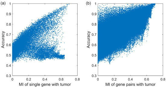 Scatter diagram between MI and accuracy: (a) MI and accuracy of single gene; (b) MI and accuracy of gene pairs.