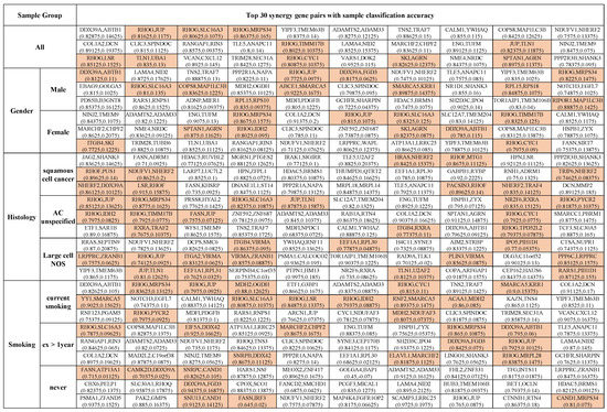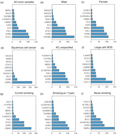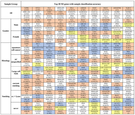 We calculated the MI and accuracy not only for all tumor samples, but also by gender (male, female), histology (squamous cell cancer, AC unspecified, large cell/NOS), and smoking status (current smoking, smoking ex > 1 year, never smoking). Then, we select the top 30 genes with high MI and label their sample classification accuracies in Figure 2. Among the 11 genes marked in orange, S1PR1, STX11, FHL1, INMT, ADAMTS8, and NLRC4 have been shown to be significantly downregulated in expression in NSCLC, while FLI1, ADH1B, and ADAMTS8 are strongly associated with the prognosis of NSCLC patients [16,18,20]. Patients with high FLI1 expression, identified as an independent poor prognostic factor in NSCLC, had shorter overall survival than those with low FLI1 expression, and exonic loop RNA of FLI1 acted as a novel oncogenic driver to promote small cell lung cancer tumor metastasis [18]. ADAMTS8 is also an important gene in lung cancer, and its high expression is associated with high overall survival in lung cancer patients. ADAMTS8 is also aberrantly downregulated in NSCLC cells, promoting cell proliferation and reducing apoptosis [21].