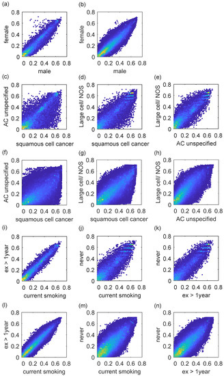 After calculating the MI, we make a comparison between single gene and gene pairs in Figure 4. According to Figure 4a,b, the differences of some genes, such as TTTY10, HSFY1, and RBMY1A1, are obvious, and the female patient index is much higher than the male one. However, there are no more studies on gender differences. According to Figure 4c–h, there are significant differences in gene expression, such as DSC3 and GJB5, among the three histologies, especially in squamous cell cancer. According to Figure 4i–n, there is a significant difference in smoking or not, but the difference of current smoking and quit smoking over a year is relatively small. Genes such as PLPP3 and PPAT are all associated with smoking status [25,26].