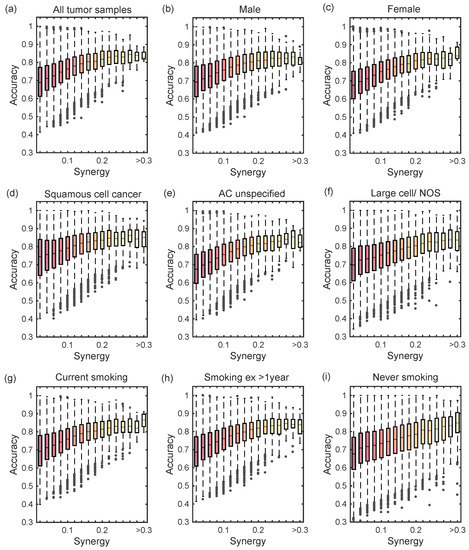 Boxplot of synergy and accuracy of gene pairs for different sample groups: (a) all tumor samples type; (b) male; (c) female; (d) squamous cell cancer; (e) AC unspecified; (f) large cell/NOS; (g) current smoking; (h) smoking ex > 1 year; (i) never smoking.