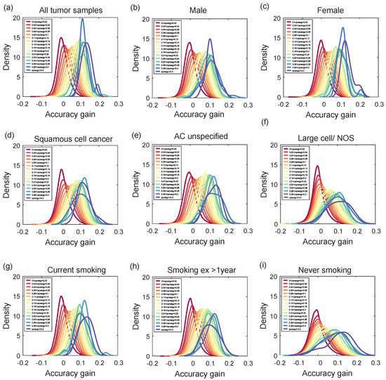 Density plot of accuracy gain of gene pairs for different sample groups. Each curve corresponds to a synergy range: (a) all tumor samples types; (b) male; (c) female; (d) squamous cell cancer; (e) AC unspecified; (f) large cell/NOS; (g) current smoking; (h) smoking ex > 1 year; (i) never smoking.