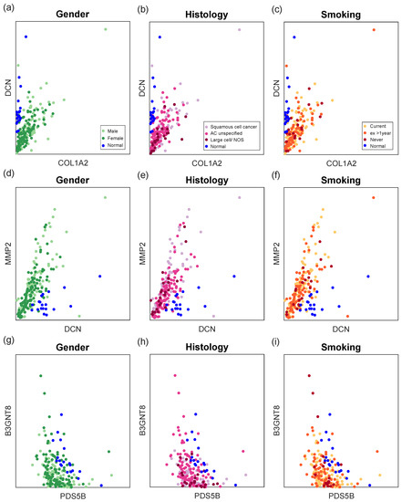 The expression of top synergy gene pairs is illustrated in Figure 8 to make it clear that these gene pairs can better differentiate disease samples from normal samples than individual genes. In general, normal samples have almost zero COL1A2 expression and high DCN expression, as well as low MMP2 expression. Moreover, NSCLC cells benefit from downregulation of PDS5B and B3GNT8 [32,33]. In addition, our results show that PDS5B and B3GNT8 have some negative correlation. The association of these genes with NSCLC has been studied accordingly, and the synergy-based information gain of gene pairs should be given more emphasis in the future.
