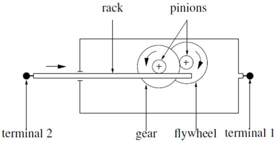 The ideal inerter is a two-terminal mechanical device that has the property that equal and opposite forces applied at two terminals are proportional to the relative acceleration between nodes [12,13]. Now, various physical models of an inerter have been proposed by researchers. The most widely known model is one that incorporates a rack-and-pinion to transform the translational kinetic energy associated with the relative motion of the device terminals into rotational kinetic energy at a lightweight fast-spinning “flywheel” [12,13]. The inertance of such a flywheel-based inerter depends primarily on the number of gears and the gear ratio used to drive the flywheels, rather than on the mass of the flywheels. A schematic representation of the inerter device is presented as a hatched box in Figure 2 [13].