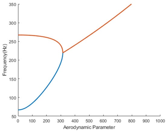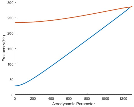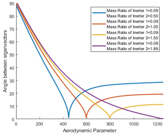 Figure 16 is a schematic diagram of the case with inerters installed at joints 4 and 5. The simulation results are illustrated in Figure 17, which depicts the coalescence of modes 1 and 2. Figure 18 shows the relationship between the critical aerodynamic pressure parameters and the angle between the eigenvectors of modes 1 and 2. The optimal critical aerodynamic pressure parameter value is 1271, while the respective effective mass ratios of inerter 1 and inerter 2 are 0.31 and 1.93, which can be found in Table 4. When compared to the results with one inerter, this method increases the critical aerodynamic parameter by 40. However, the sum of the effective mass ratio has a total value of 1.98, compared to 1.53 with one inerter.