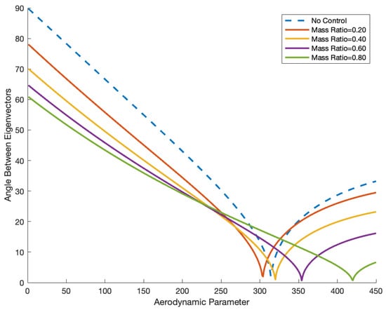 Angles between eigenvectors for different aerodynamic pressure parameters of 2 inerters installed at joints 4 and 5.