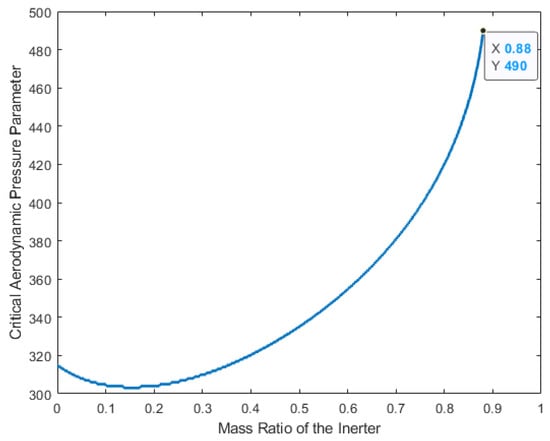 The strategy with one inerter is used to explore its effect on flutter control. It can be modeled as a nonlinear programming problem. The objective is to maximize the critical aerodynamic pressure parameter corresponding to the onset of flutter as seen in Equation (16):