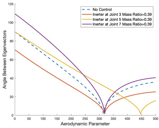 Angles between eigenvector for different aerodynamic pressure parameters of 2 inerters installed at joints 3 and 5.