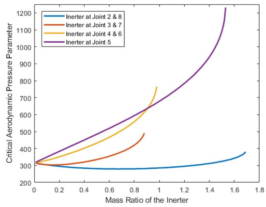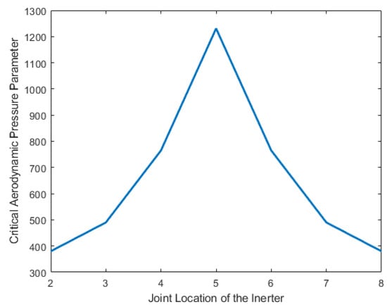 With variable effective mass ratios, the optimal critical aerodynamic parameter can be achieved for different locations of inerters. The optimized results are illustrated in Figure 12 with data given in Table 1. It can be noted that the peak critical aerodynamic pressure parameter 1231 can be achieved by using an inerter with an effective mass ratio of 1.53 located at the midspan joint 5. For this wide-beam panel model with both ends simply supported, it is seen that the effectiveness of flutter control can best be obtained when an inerter is installed in the midspan of the wide beam. It is interesting to observe that the critical aerodynamic pressure is shifted to the highest value of 1231 when the inerter is placed at the midspan of the beam panel, and the preferred joint locations are ranked as 5, 4 and 6, 3 and 7, and 2 and 8. Further increasing the effective mass ratio will cause the two lowest modes to no longer coalesce, and coalescing may occur at higher modes. However, for this study, only coalescing of the first two modes will be analyzed. From a practical viewpoint of engineering design, investigating coalescing above the first two lowest modes may be beyond the scope of the present basic conceptual study. It is of interest to note that while summarizing the results as shown in Figure 10 and Figure 12, there seems to be a correlation between the first natural mode shape of a simply supported wide-beam panel and the optimal placement of inerters. Thus, the mode shape of the lowest natural frequency may serve as a reference basis for the placement of the inerter.