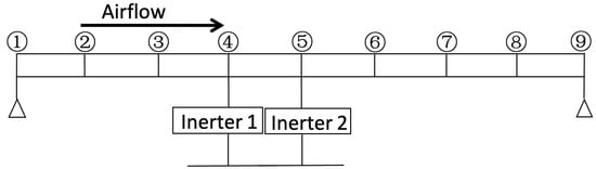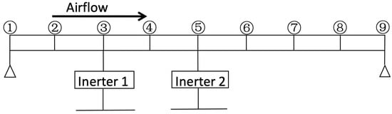 Schematic diagram of flutter control with 2 inerters installed at joints 4 and 5, out of 9 joints, for an 8-finite-element model.