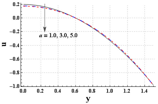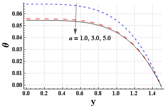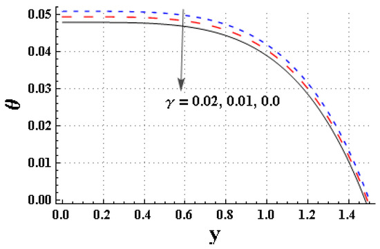 Figure 7, Figure 8, Figure 9, Figure 10, Figure 11 and Figure 12 are generated to analyze the temperature changes in the system for varying values of relevant parameters. Figure 7 is plotted to express the impact of on the temperature. The higher values of facilitated the heat-transport process, and therefore the temperature of the fluid rapidly decayed. Figure 8 describes that the temperature of the fluid can be reduced by minimizing the values of the Brinkman number. Figure 9 signifies the impact of “” on temperature. The temperature profile decreased by increasing the “” coefficients. Figure 10 is generated to observe the impact of the thermal jump coefficient on temperature. It is noted that as the thermal jump parameter () increased, the temperature exhibited an upward trend. Figure 11 indicates that the temperature slightly increased by increasing the thermal Grashoof number. Figure 12 expresses the effect of “” on temperature. The fluid temperature decayed by increasing the fluid parameter “”.