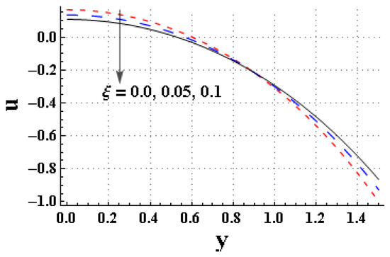 Effect of velocity slip parameter, , on velocity, u.