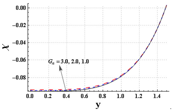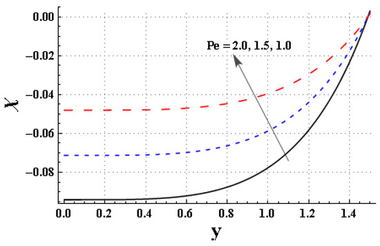 The impact of , , , and on the concentration of nanomaterials is studied through Figure 13, Figure 14, Figure 15, Figure 16 and Figure 17. Figure 13 depicts the impact of on the concentration of nanomaterials. The concentration of nanomaterial increased by increasing the thermophoresis parameter. Figure 14 is sketched to highlight the impact of the Brownian motion coefficient on the concentration of nanomaterials. The concentration of nanomaterial decayed near the channel wall by increasing the . The concentration of nanomaterial decayed near the wall by enhancing the (see via Figure 15). Figure 16 indicates that decayed near the channel wall for higher values of . Figure 17 is outlined to notice the effect of on the . The concentration of nanomaterial intensified for higher values of the non-Newtonian parameter, .