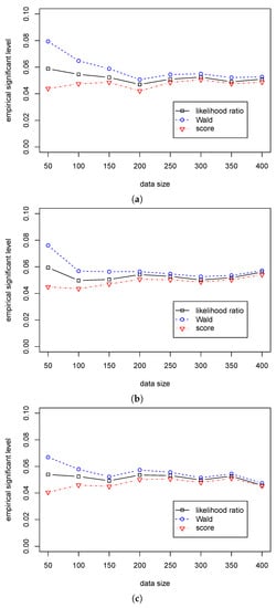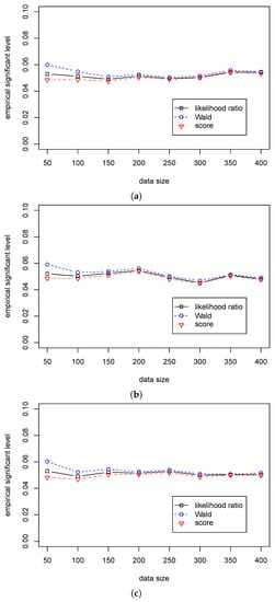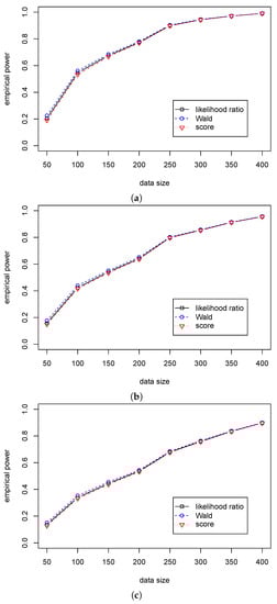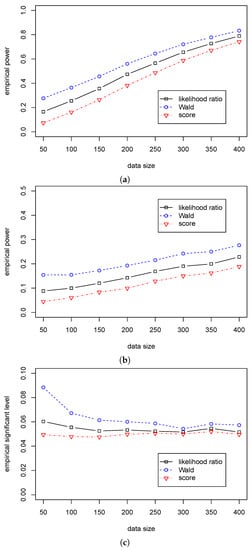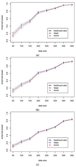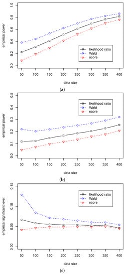 In this subsection, we explore the performances of the likelihood ratio, Wald and score statistics presented in (18)–(20) for the hypothesis testing in (17) with various parameter configurations. The sample sizes are set to be , where means from to with step size s, and other parameters are set as follows:
